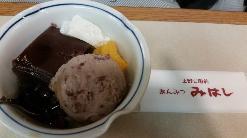 Lors de nos visites à Ueno, nous aimons particulièrement cet endroit. Bien que la clientèle soit plutôt féminine et plus âgée, les desserts sont délicieux. L’an-mitsu est un dessert japonais frais composé d’un mélange de pâte de haricots azuki sucrée, d’agar-agar et de glace pilée (surtout en été). Parfois, une boule de glace au thé vert ou au sésame noir vient parfaire ce délice.