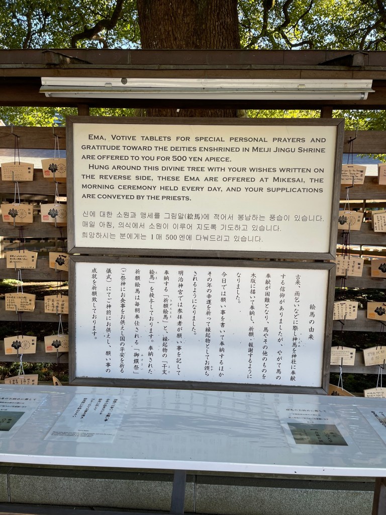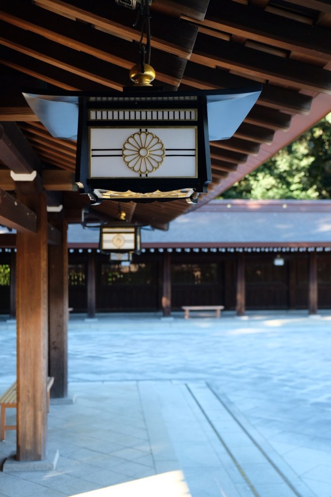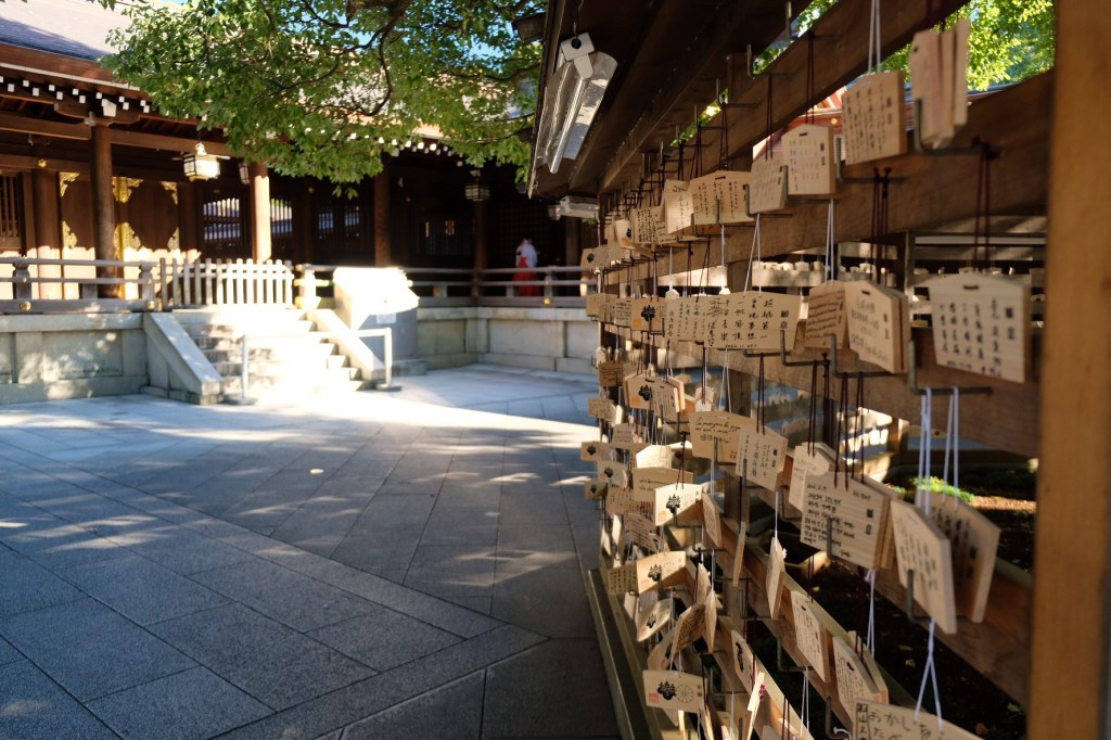 Au temple Shinto, on entre encore par un grand Torii. Une fois les mains lavées à la fontaine, on passe de belles portes avec des dorures. On arrive ensuite sur une esplanade avec un arbre de voeux et un panneaux (ema) de voeux du monde entier. Parfois, on peut y avoir un mariage traditionnel japonais se dérouler.