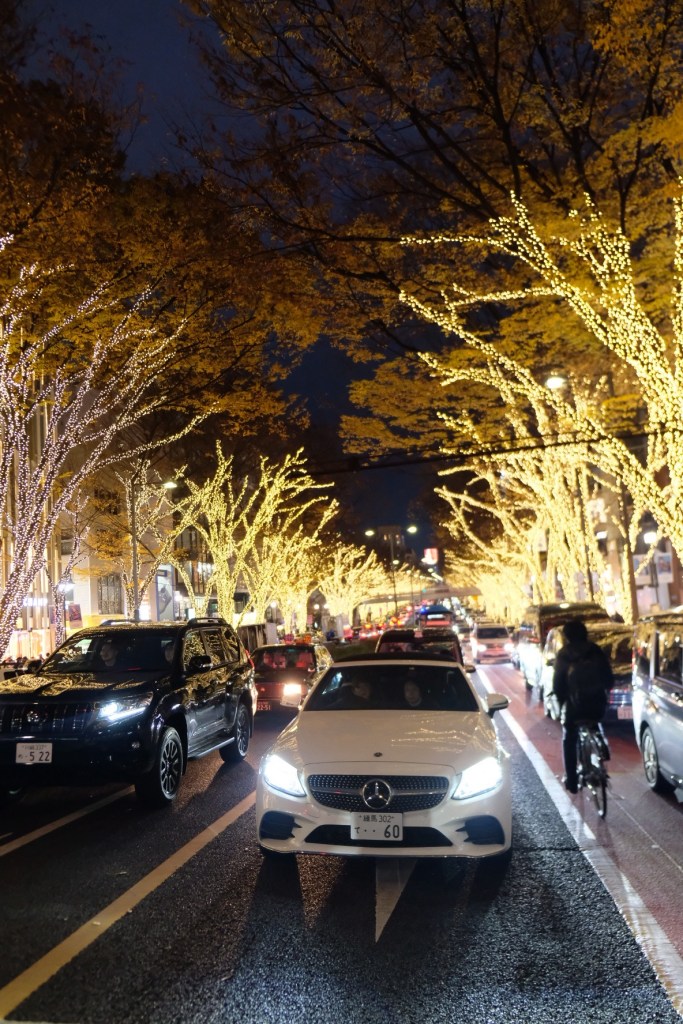 Omotesando, on l’aime ou on ne l’aime pas mais vous verrez que l’architecture des magasins fait partie de son charme. On n’est pas à Ginza mais bon tout de même. On dit souvent que ce sont les champs élysées de Tokyo car il y a tous les magasins de luxe, 2 grands trottoirs. L’hiver, il y a aussi des illuminations.