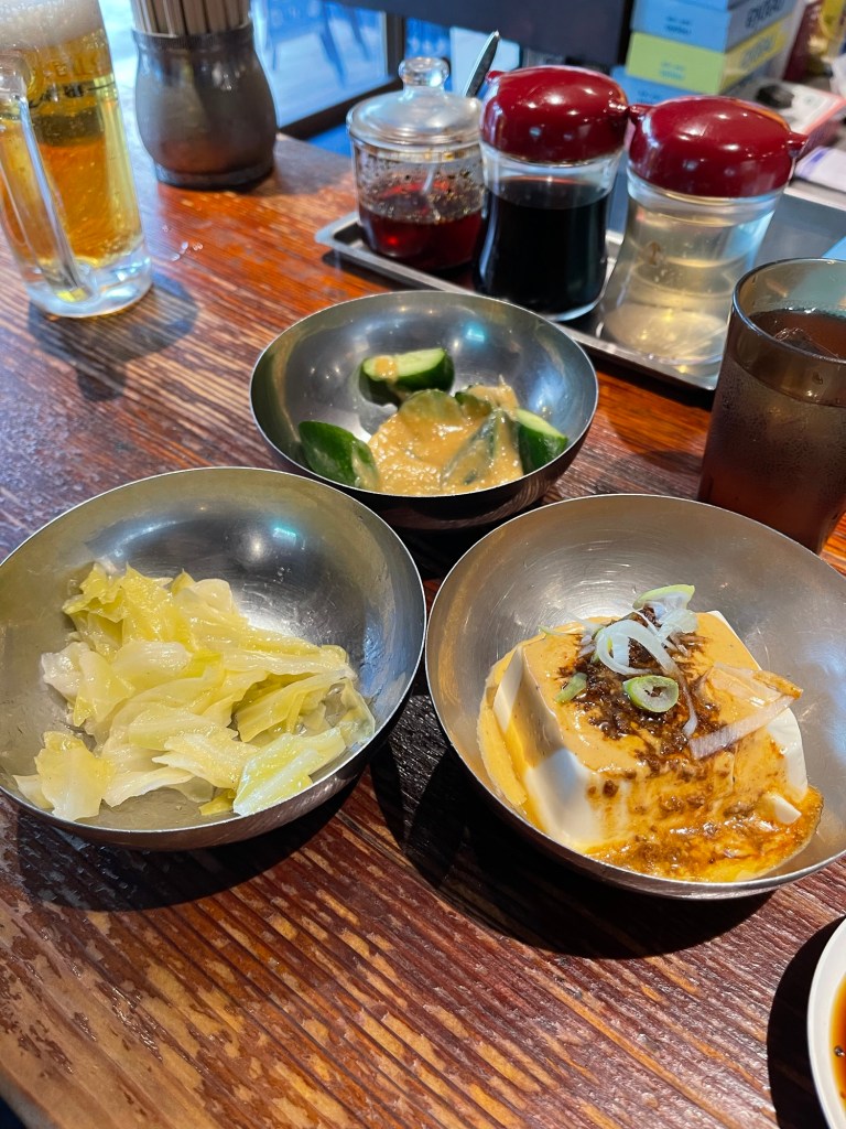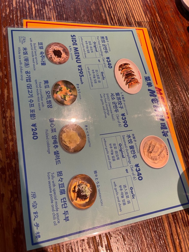 S’il y a une expérience à tenter à Harajuku c’est le gyoza bar Gyozaro. J’ai bien suivi l’évolution de ce restaurant depuis 2013. La carte n’a pas changé. Le lieu est toujours aussi convivial. On y mange coude à coude avec notre voisin si l’on est proche de l’ilôt central. Sinon il y a des tables en bois sur les côtés ou derrière près des toilettes. Cet endroit fait partie de mes repères à Tokyo clairement. J’y vais à chaque fois. La carte propose des gyozas de 3 variétés cuits à la vapeur ou au grill. Des bières, de l’umeshu, du whisky, des concombres, des endamame…rien d’autres. On n’est pas dans un ramen ya ni un sushi ya. Une cuisine simple qui séduira les routards à petits budgets qui cherchent une ambiance. Les gyozas sont déposés sur le grill huilés, puis le serveur ajoute du bouillon et ça fume. Préparez vous à faire la queue mais en général ça va vite.