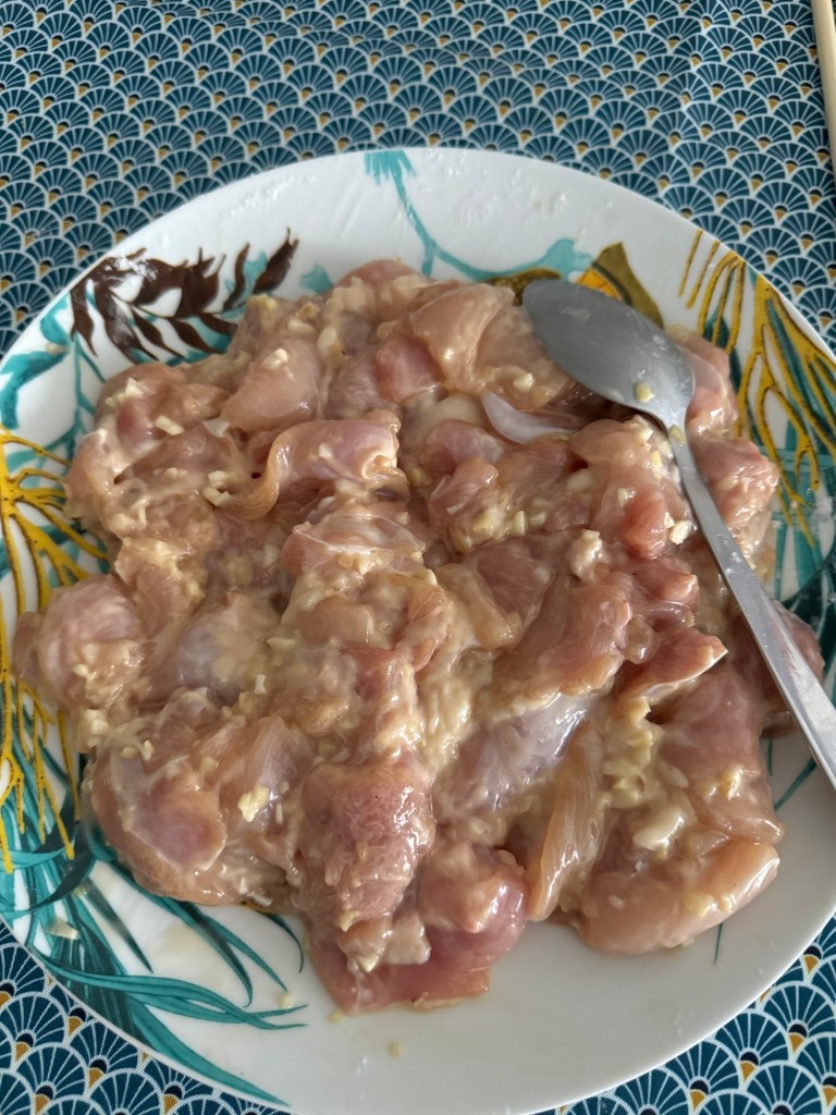 - Mariner le poulet pendant 15 minutes avec le sel, poivre, sauce soja, saké, gingembre et ail.